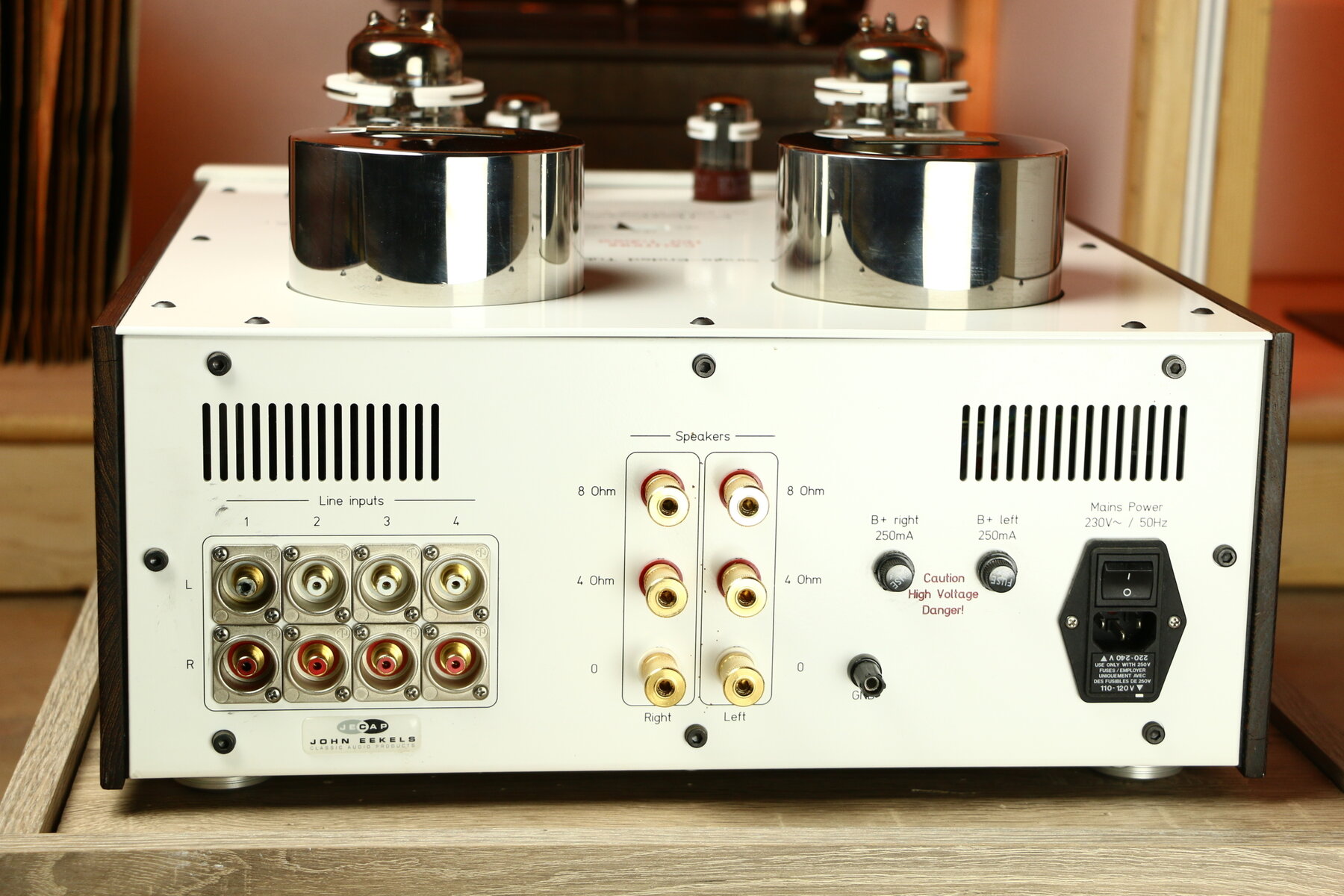 Deze klasse-A geschakelde Single-Ended versterker is het levenswerk van meesterbouwer John Eekels, en is een money-no-object-missie op buizengebied. Het betreft een uniek paradepaartje waarvan dus geen tweede bestaat. Deze versterker concurreert met de wereldtoppers uit de stal van Audio Note, LAMM, Air Tight en Zanden. Je staat er van versteld dat deze versterker met 2 x 15 Watt zo'n beetje alles kan aansturen. Ieder onderdeel is minutieus uitgekozen en over de hele wereld gesourced. Commercieel is een dergelijke versterker niet rendabel te produceren, aangezien minimaal boven de 30.000,00 zou uitkomen. De bouw heeft 10 maanden gekost, en op onderdelen is helemaal niets bespaard, John Eekels kon de beste kersen aan onderdelen plukken, en dat wereldwijd. Deze man is allereerst een vakman uit de uitzonderlijke klasse. Alleen aan onderdelen zit er al voor meer dan de vraagprijs in. Dit ding is absurd!