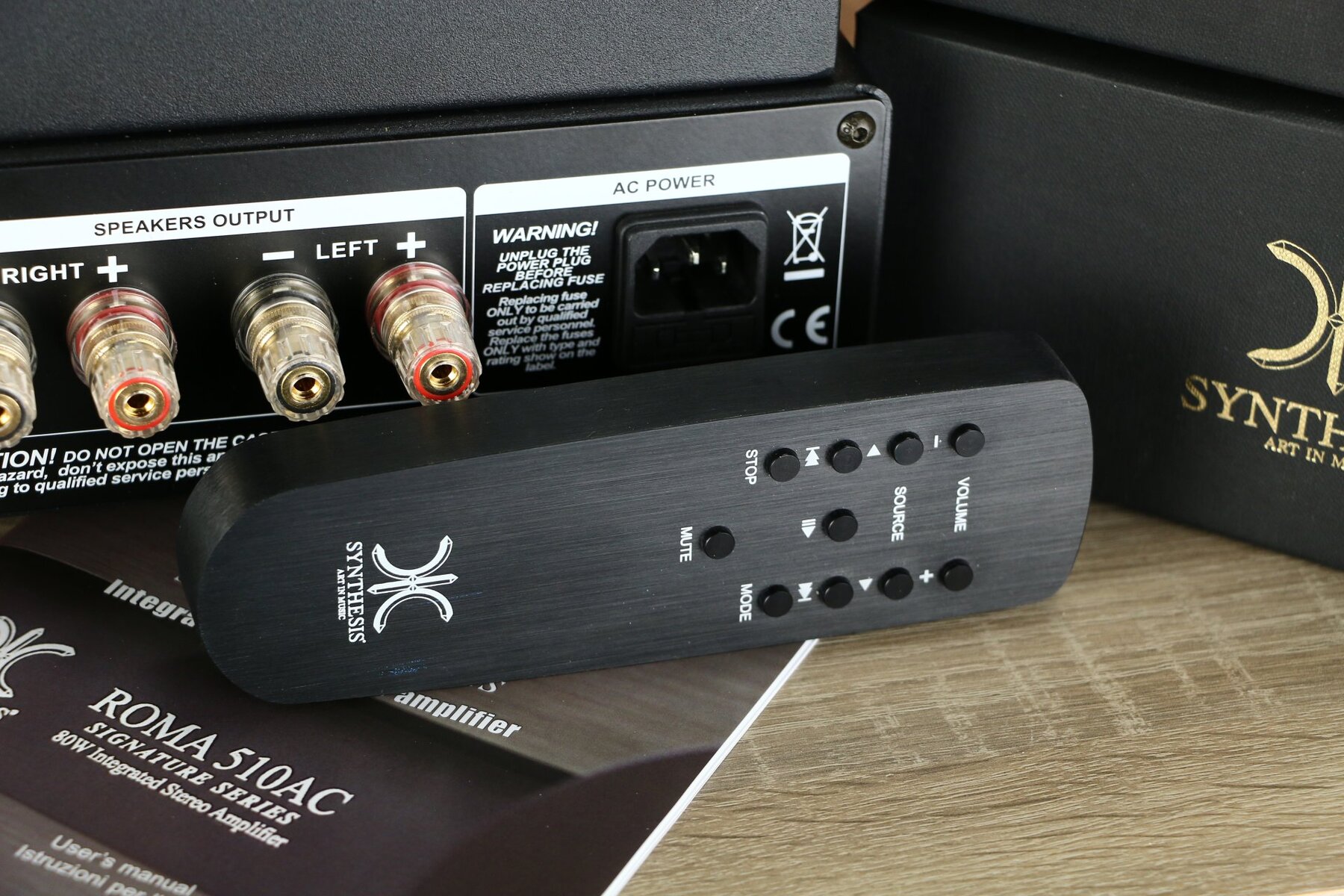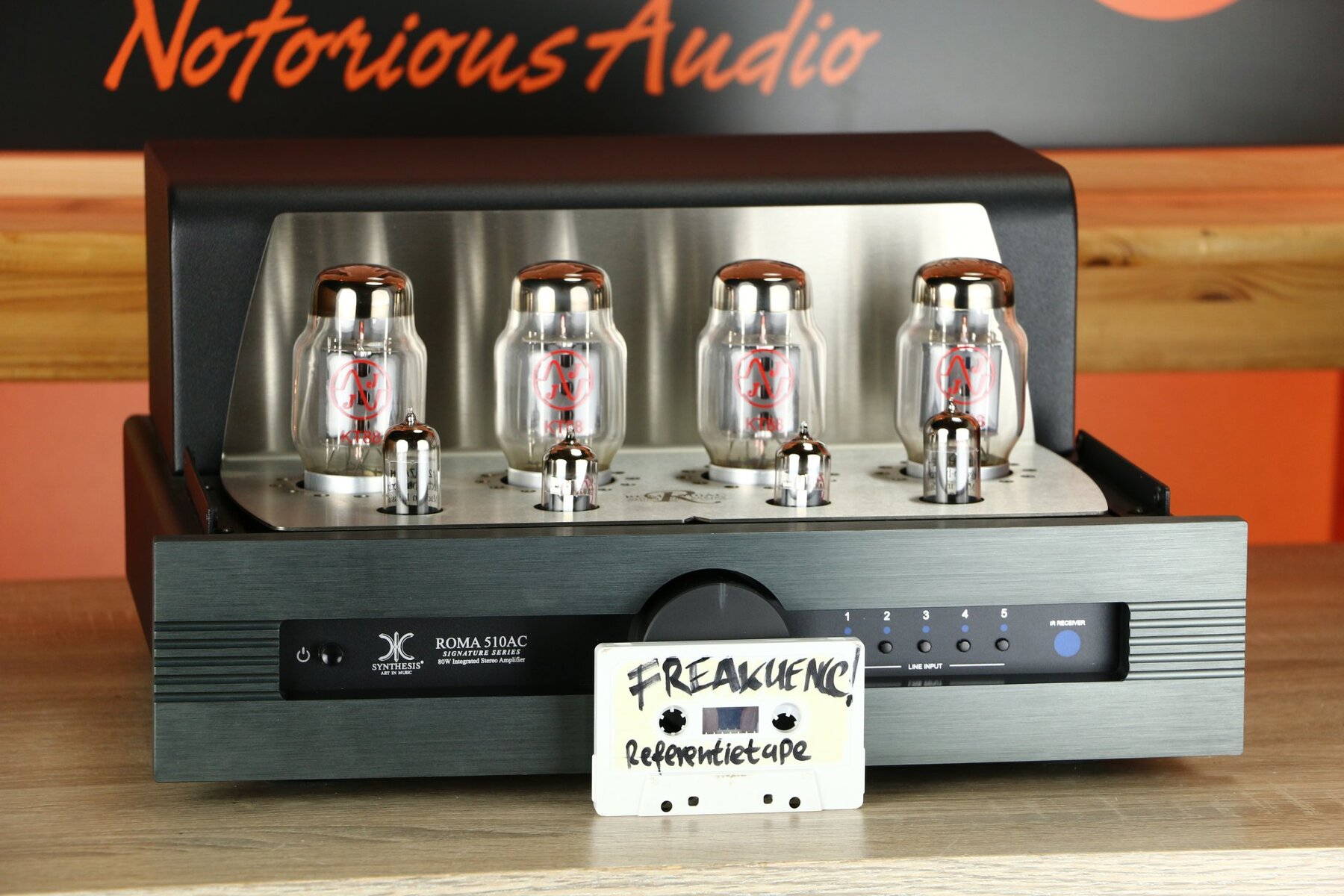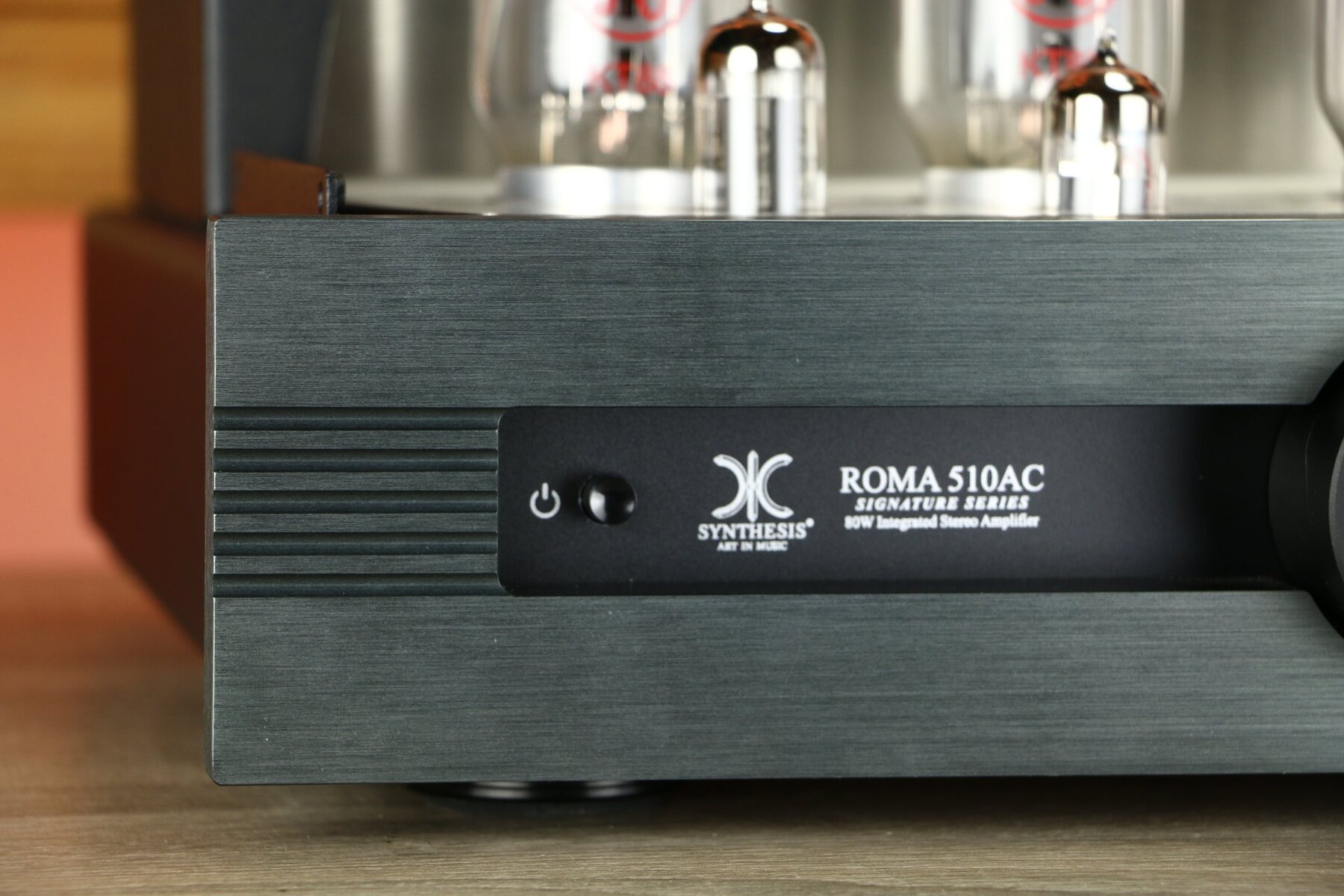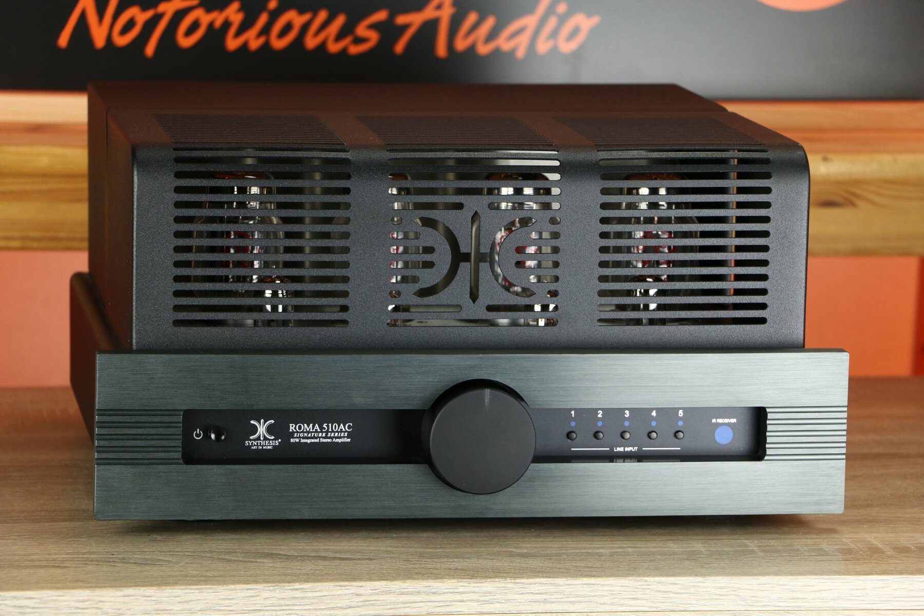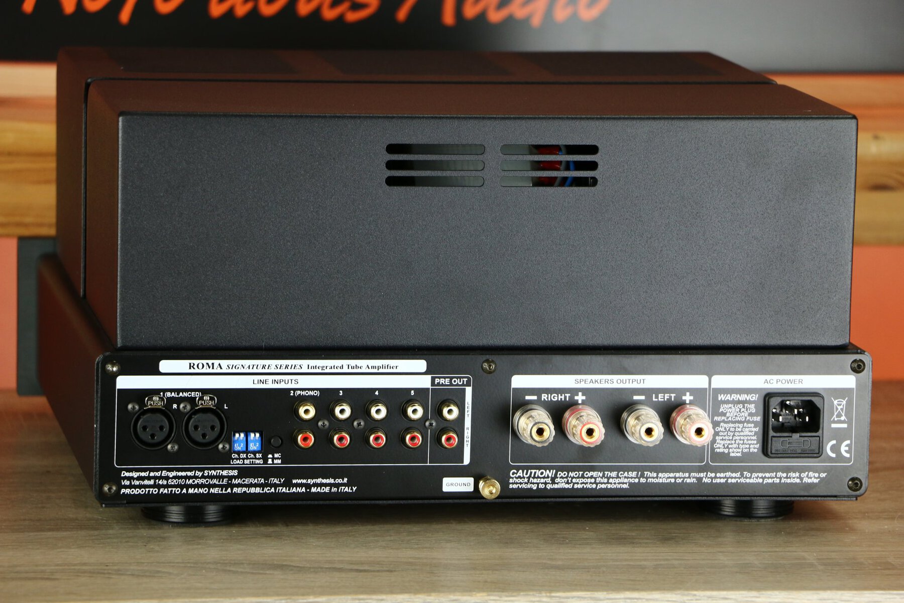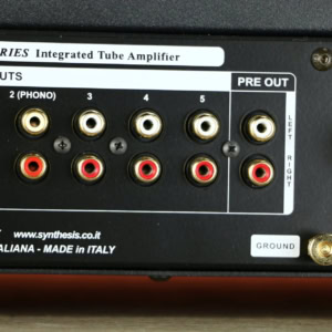 Der Verstärker verfügt über ein robustes Metallgehäuse und ein Röhrenschutzgitter mit dem Synthesis-Logo, das eine optimale Kühlung und den Schutz der Röhren gewährleistet.