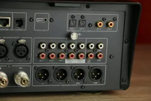 This system delivers 2x 180W of power at 8Ω and 2x 300W at 4Ω, with a harmonic distortion of 0.002% at 80% power. It features three RCA inputs, one XLR input, and MM and MC phono inputs. Digital inputs include HDMI eARC, two coaxial and two optical connections. Supported streaming formats include FLAC, WAV, AAC and DSD up to 256. Wireless connectivity is provided via Wi-Fi and Bluetooth 5.4. The system supports Apple AirPlay, Google Cast, Spotify Connect and Tidal Connect. An 8.8-inch high-resolution display shows album covers and metadata. Optional features include dual subwoofer outputs and Dirac Live Room Correction. Dimensions: 432 x 390 x 140 mm; weight: 17 kg.