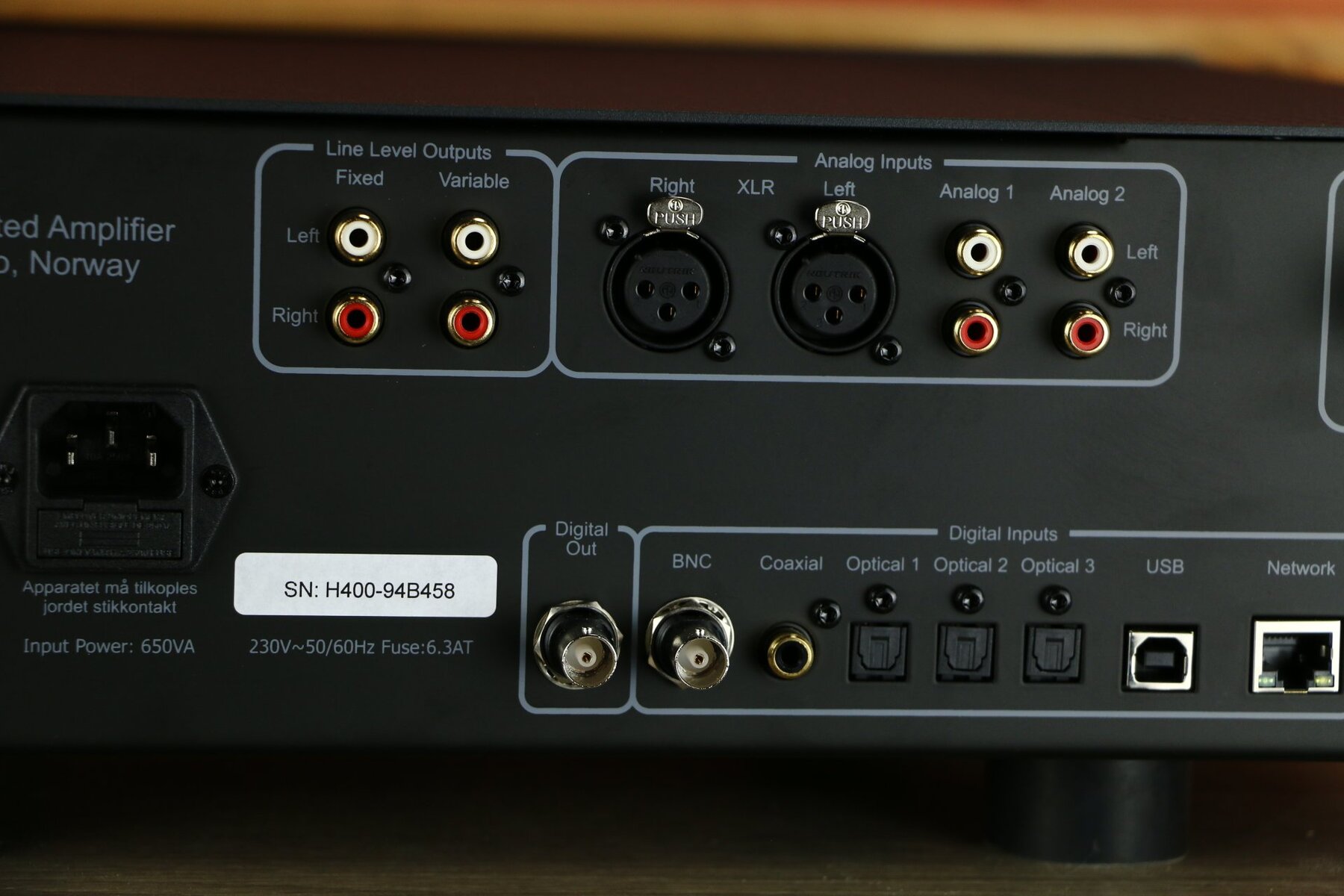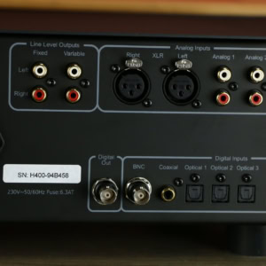 What digital inputs are available?The H400 has 1 coaxial BNC, 1 coaxial RCA, 3 optical, 1 USB and 1 network digital input.