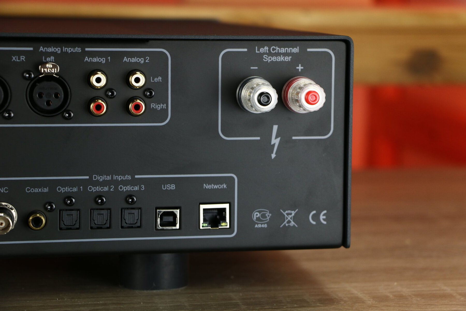 The amplifier features 1 balanced XLR input and 2 unbalanced RCA inputs.