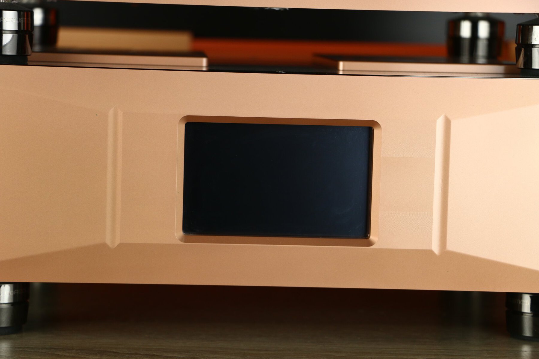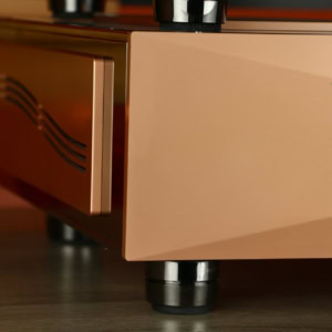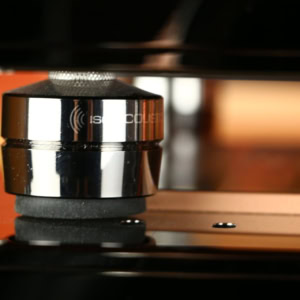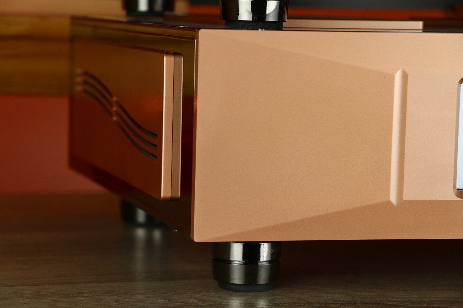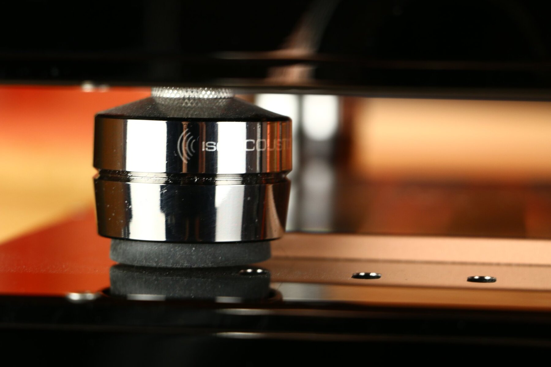 The amplifier is equipped with GAIA III feet from IsoAcoustics for optimal vibration damping.