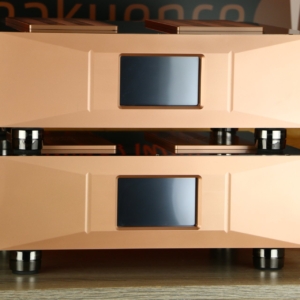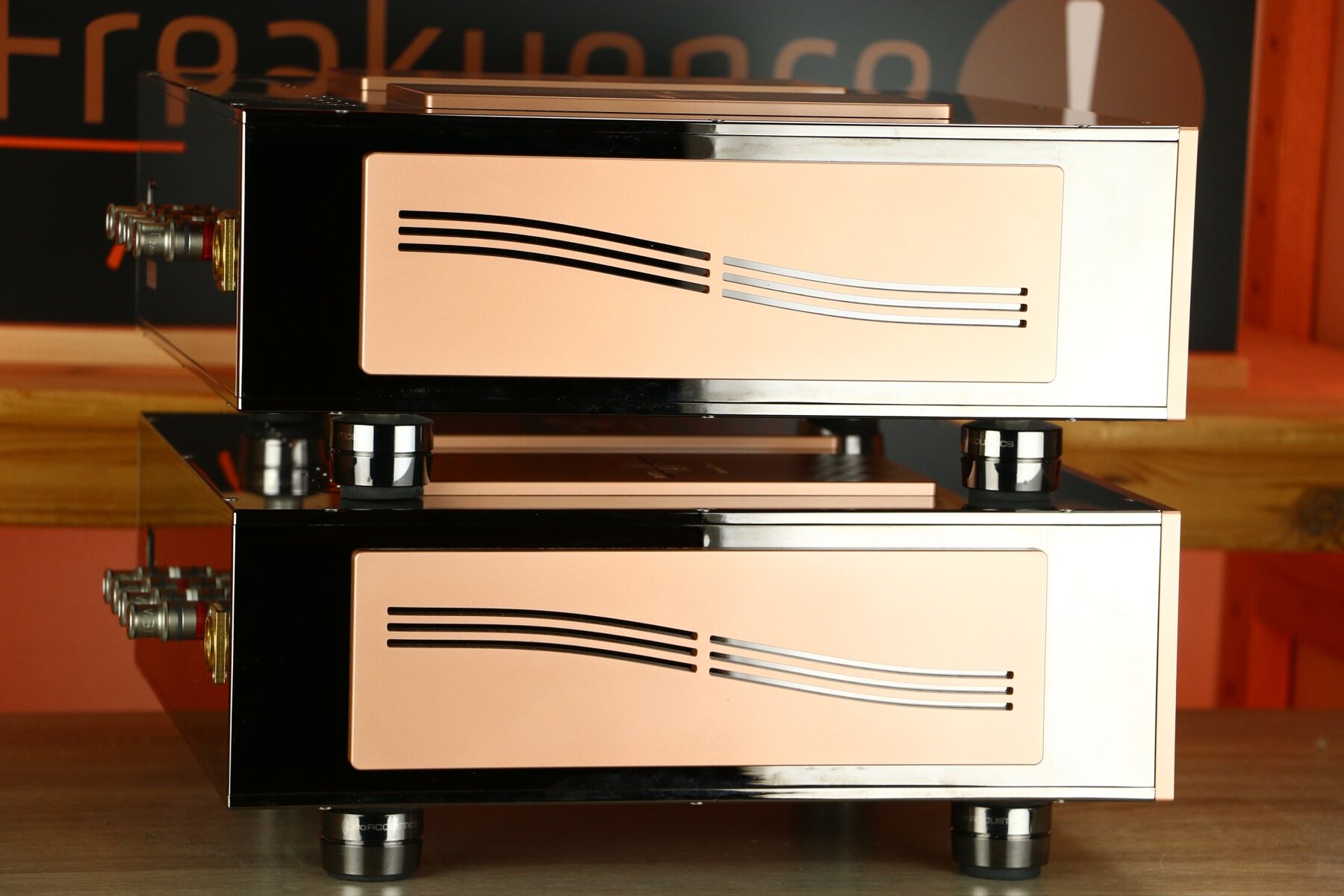 The Merrill Audio Element 116 monoblock power amplifiers combine advanced technology with stylish design. They use Gallium Nitride (GaN) transistors, known for their speed and efficiency. This results in detailed and accurate reproduction of music. The feedback-free design contributes to a transparent and natural sound. The cabinet is finished in high-gloss nickel with rose gold accents, providing an elegant look. The amplifiers feature high-quality components, such as rhodium-plated power connections and pure copper speaker terminals. They are designed to drive a wide range of speakers and offer powerful and controlled sound reproduction. The Element 116 amplifiers are suitable for listeners looking for a combination of technical sophistication and aesthetic appeal.