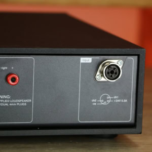 The amplifier features left and right outputs with 4 mm “banana” jacks.