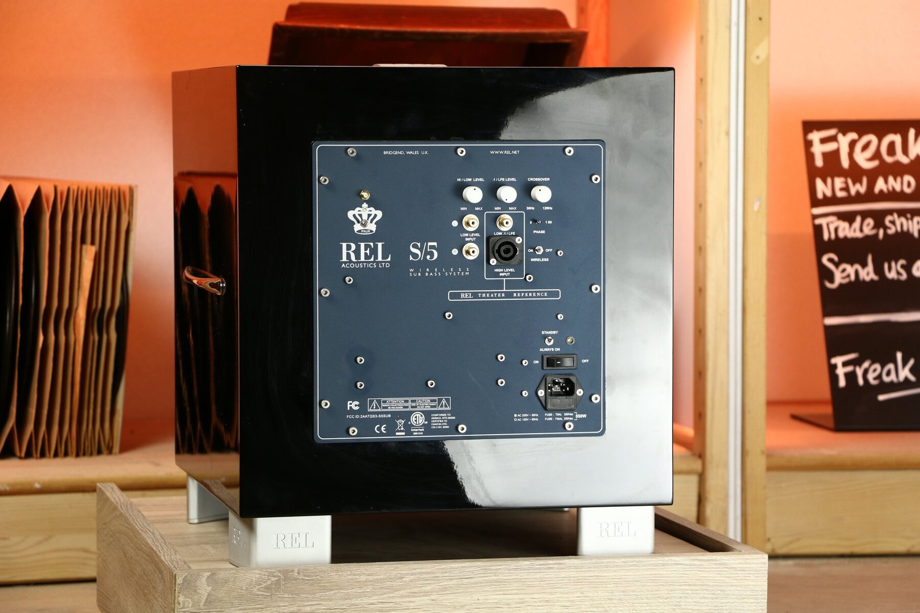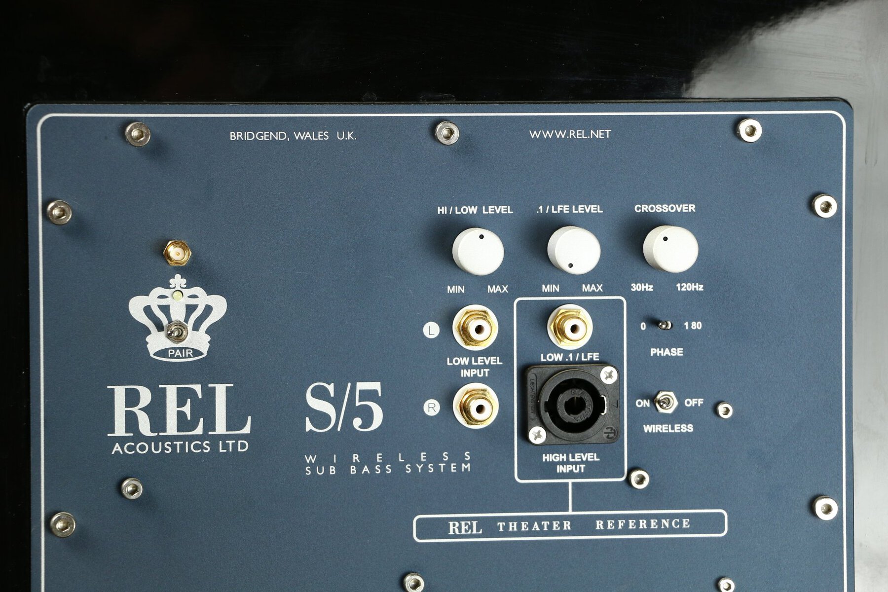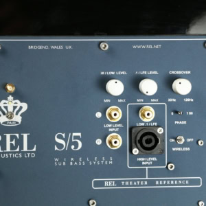 The REL S5 offers High-Level Neutrik Speakon, Low-Level RCA and LFE RCA inputs, as well as an SMA connector for the wireless antenna.