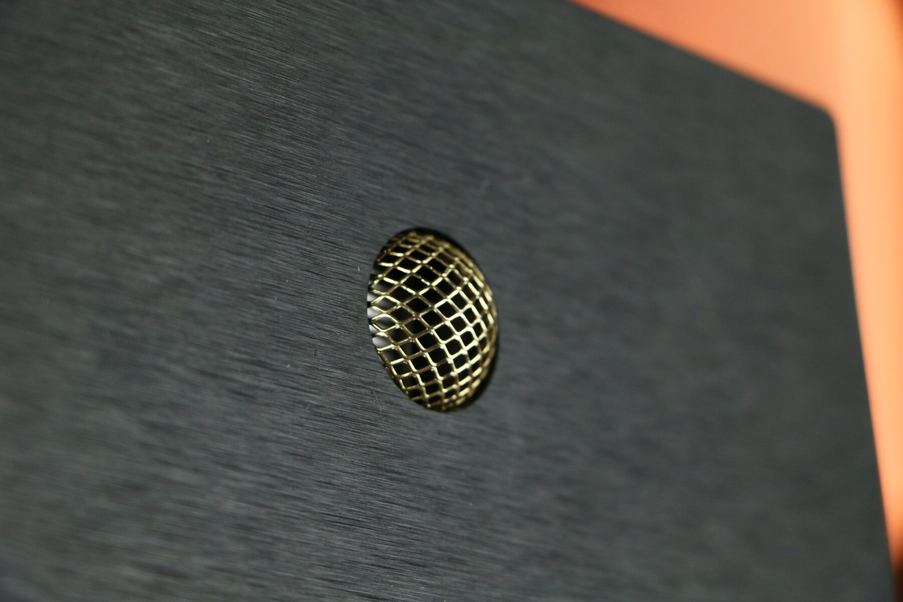 The enclosure consists of a multilayer composite of aluminum panels, HDF and rubber cushioning.