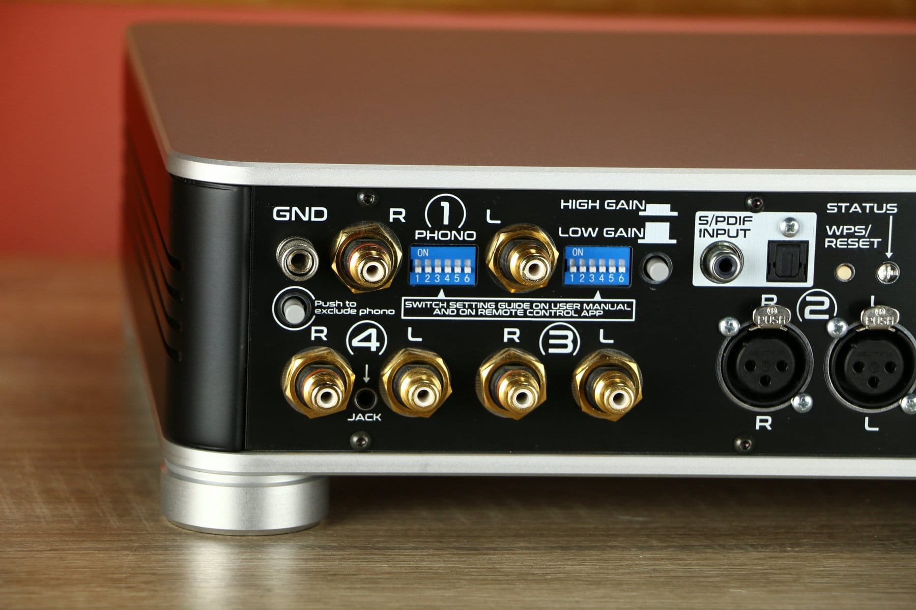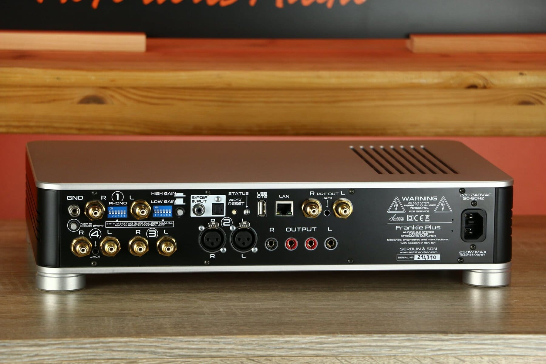 The Frankie Plus offers inputs for phono MM/MC, XLR line and two RCA line inputs, as well as a USB-A 5V jack for powering external dongles.