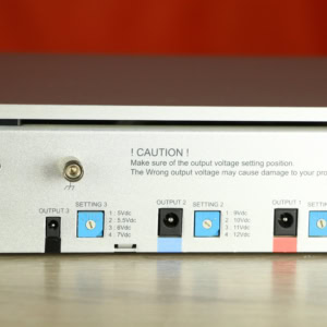 Output voltages are set using switches on the rear panel, with each output having four selectable voltage levels.