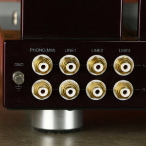 The amplifier features three RCA line inputs and one MM phono input for turntables.