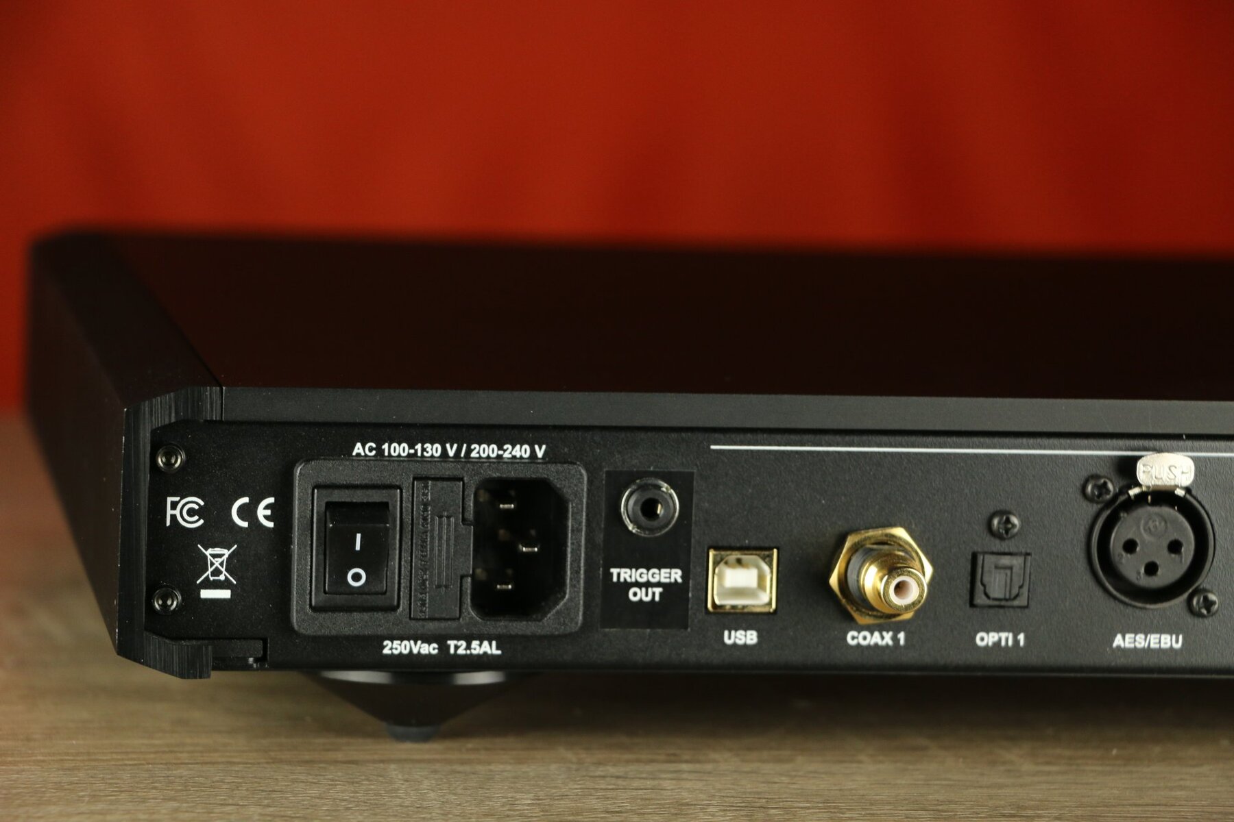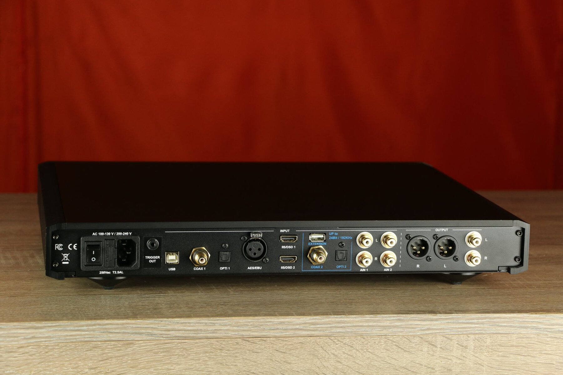 Cet appareil dispose de neuf entrées numériques et de deux entrées analogiques, dont USB Type B 2.0 Hi-Speed, deux IIS/DSD, deux coaxiales, deux optiques, une AES/EBU et un port d'extension pour Bluetooth. Les sorties analogiques comprennent des RCA asymétriques et des XLR symétriques. Il prend en charge le PCM jusqu'à 768 kHz, le DSD jusqu'à DSD512 et le MQA. L'alimentation utilise des transformateurs C-Core et une batterie de condensateurs d'environ 60 000 uF. L'appareil est doté d'un préamplificateur de classe de référence avec des composants MUSES8820 et MUSES72320V. Un module d'extension pour le streaming est disponible en option.