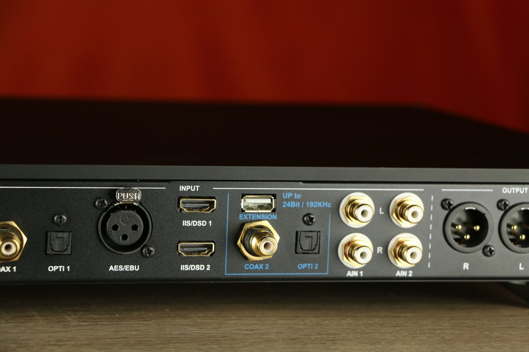 Cet appareil dispose de neuf entrées numériques et de deux entrées analogiques, dont USB Type B 2.0 Hi-Speed, deux IIS/DSD, deux coaxiales, deux optiques, une AES/EBU et un port d’extension pour Bluetooth. Les sorties analogiques comprennent des RCA asymétriques et des XLR symétriques. Il prend en charge le PCM jusqu’à 768 kHz, le DSD jusqu’à DSD512 et le MQA. L’alimentation utilise des transformateurs C-Core et une batterie de condensateurs d’environ 60 000 uF. L’appareil est doté d’un préamplificateur de classe de référence avec des composants MUSES8820 et MUSES72320V. Un module d’extension pour le streaming est disponible en option.