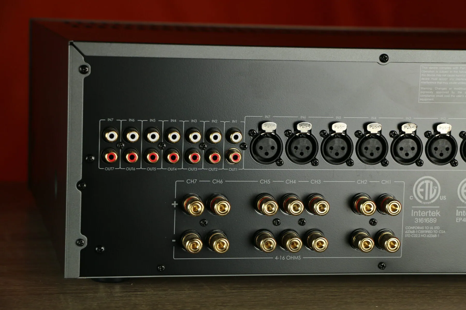 Deze 7-kanaals eindversterker uit de HDA-serie levert 140 watt per kanaal bij 8 ohm in stereo en 100 watt per kanaal bij 8 ohm wanneer alle kanalen worden aangestuurd. Het ontwerp is gebaseerd op klasse G-technologie, wat zorgt voor een efficiënte inzet van vermogen. De ingangen bestaan uit zowel gebalanceerde XLR als ongebalanceerde RCA-aansluitingen. Ethernetbesturing en 12V triggers zijn geïntegreerd. RS232-besturing is optioneel beschikbaar. Het frequentiebereik loopt van 20 Hz tot 20 kHz met een totale harmonische vervorming van 0,002%. De signaal-ruisverhouding bedraagt 117 dB, gemeten via de gebalanceerde ingang.