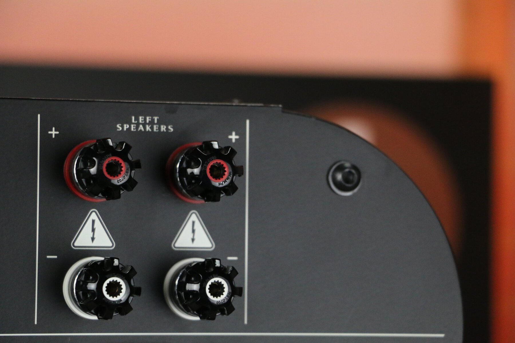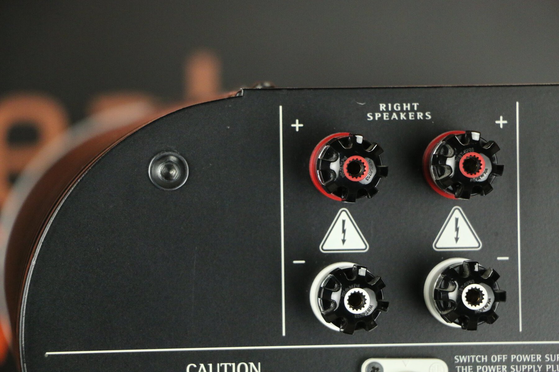 Sluit de luidsprekers aan op de luidsprekeruitgangen aan de achterzijde van de versterker, gemarkeerd als 'Left' en 'Right Loudspeaker Outputs'.