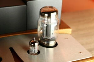 Van één van de KT88-buizen is het geleidestukje eraf. De pinnen natuurlijk niet. Buis zit in de voet zoals het hoort.